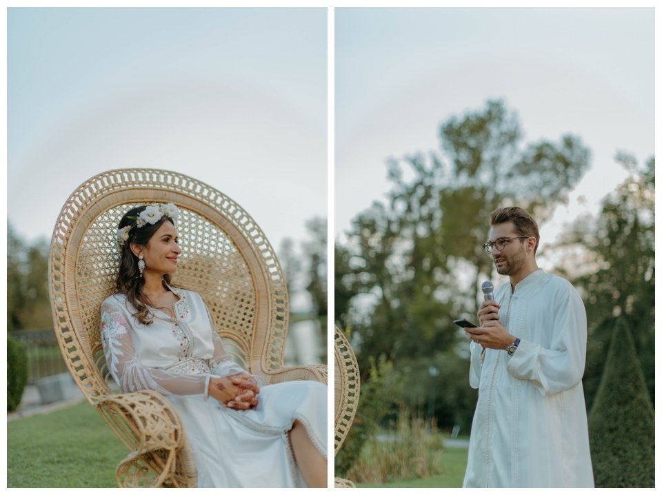 « Je veux montrer la richesse des 2 cultures. » C’est ce que Sofia m’avait dit pendant notre rendez-vous. Pari tenu! Après un passage à la mairie où elle portait une robe de dingue signée Sophie Sarfati. Retour au beau Château d’Epeyssoles ou leur soeur et leur meilleur pote leur avaient préparés une cérémonie laïque en extérieur.